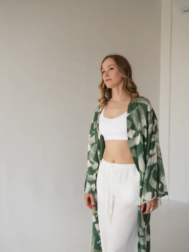 Long forest green hand-painted linen kimono
